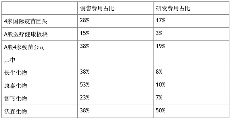 從科研投入來看,其與國際巨頭亦存在巨大差距。以A股為例,目前上市有4家以疫苗為主業(yè)的企業(yè)。Wind數(shù)據(jù)顯示,2017年4家疫苗公司總銷售費(fèi)用達(dá)18億元,占營業(yè)收入38%;4家國際疫苗巨頭(輝瑞、默沙東、賽諾菲、GSK)總銷售費(fèi)用占比28%。反觀研發(fā)費(fèi)用,A股醫(yī)療保健板塊總研發(fā)費(fèi)用319億元,占總營業(yè)收入的2.8%;4家疫苗公司除沃森生物外,研發(fā)費(fèi)用占比均未超過10%;4家國際疫苗巨頭總研發(fā)費(fèi)用占比17%。