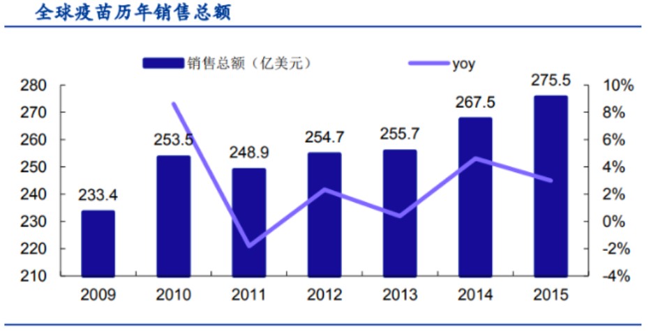 我國有45家疫苗生產(chǎn)企業(yè),可生產(chǎn)63種疫苗,預(yù)防34種傳染病,是世界上為數(shù)不多的能夠依靠自身能力解決全部計(jì)劃免疫疫苗的國家之一。從2005年到2015年的十年間,我國疫苗產(chǎn)業(yè)市場規(guī)模從65億元增至245億元,年均復(fù)合增長率達(dá)14%。