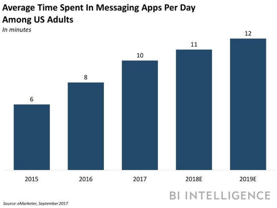 據市場研究公司eMarketer的統(tǒng)計數據顯示,去年,美國消費者平均每天在一款通訊應用上逗留的時間是10分鐘,較2016年的8分鐘增長了15.2%。這個平均逗留時間在今年有望增長到11分鐘,在2019年有望增長到12分鐘。
