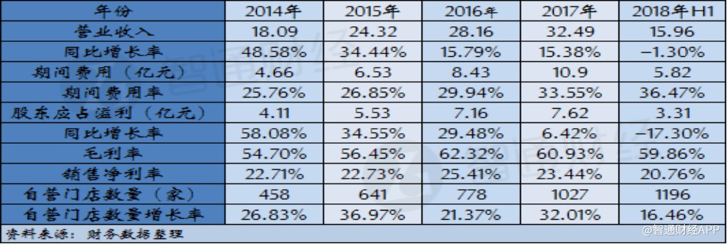 根據(jù)智通財(cái)經(jīng)APP的梳理,周黑鴨自營(yíng)門(mén)店數(shù)量在2014年為458家,此后三年公司自營(yíng)門(mén)店數(shù)量每年都有超過(guò)20%的增長(zhǎng),但期間公司營(yíng)業(yè)收入增幅卻呈現(xiàn)放緩的趨勢(shì)。與此同時(shí),公司門(mén)店數(shù)量的增長(zhǎng)也帶來(lái)費(fèi)用率逐年提升,截至2017年,公司期間費(fèi)用率達(dá)到33.55%,以至于公司凈利潤(rùn)增速同比下滑超過(guò)23個(gè)百分點(diǎn)。公司2018年中期財(cái)報(bào)顯示,上半年公司門(mén)店數(shù)量?jī)粼鲩L(zhǎng)169家,較2017年增長(zhǎng)16.46%,門(mén)店數(shù)量快速增長(zhǎng)的勢(shì)頭雖然的已延續(xù),但卻支撐不起公司營(yíng)收繼續(xù)保持增長(zhǎng),同時(shí)公司期間費(fèi)用率進(jìn)一步提升至36.47%,導(dǎo)致盈利水平大幅下滑。