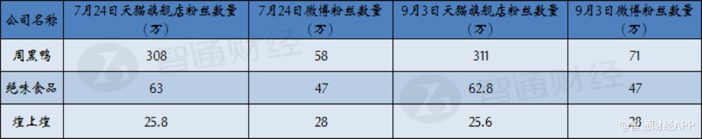 智通財(cái)經(jīng)APP曾在7月24日統(tǒng)計(jì)得到周黑鴨在當(dāng)天的天貓旗艦店粉絲數(shù)量為308萬(wàn),是其他兩大鹵制品公司的數(shù)倍,截至9月3日,周黑鴨天貓旗艦店的粉絲數(shù)量已經(jīng)增長(zhǎng)至311萬(wàn),反觀絕味和煌上煌不僅沒(méi)有增長(zhǎng)反而有小幅下滑。此外,周黑鴨微博粉絲數(shù)量在9月3日也增長(zhǎng)至71萬(wàn)較7月27日增長(zhǎng)了13萬(wàn),而其他兩家公司的微博粉絲數(shù)量還在原地踏步。