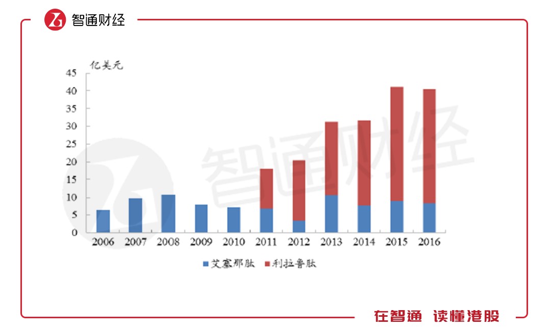 從2005年發(fā)展至今,全球已有6種GLP-1受體激動(dòng)劑相繼獲批上市,整個(gè)GLP-1受體激動(dòng)劑類藥物的全球市場(chǎng)規(guī)模已超過(guò)40億美元,2011-2016年的復(fù)合增長(zhǎng)率超過(guò)15%。而艾塞那肽作為最早上市的GLP-1類似物,上市后銷售額快速增長(zhǎng),早在2008年就突破10億美元。