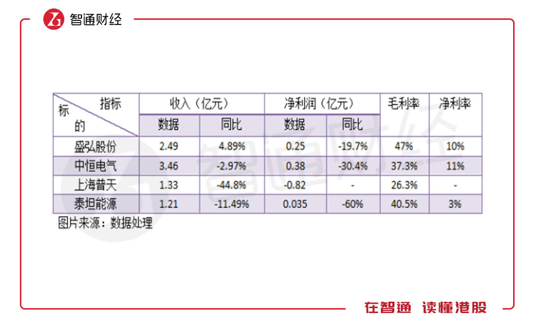 中游設(shè)備供應(yīng)商中,包括A股上市公司盛宏股份、中恒電氣、上海普天以及港股唯一一家充電樁供應(yīng)商泰坦能源技術(shù)(02188)。從收入及利潤數(shù)據(jù)上看,2018年上半年參與者收入和凈利潤均呈現(xiàn)較大幅度下滑,凄慘的很,要知道新能源汽車銷量增長了一倍多,且參與者的利潤率也很低。