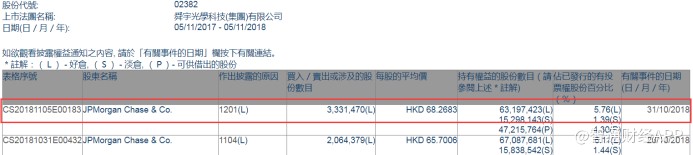 根據(jù)聯(lián)交所資料顯示,摩根大通于10月31日減持舜宇光學(xué)科技(02382)333萬股,每股作價約68.27港元,總值2.27億港元,最新持股量減至5.76%。