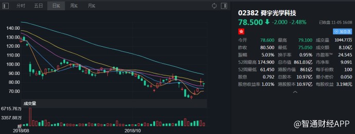 截至今日收盤,舜宇光學(xué)科技(02382)報78.5港元,跌2.48%。(張佩暄)