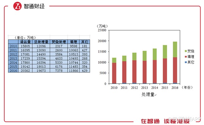 智通財(cái)經(jīng)APP統(tǒng)計(jì)到,2010至2016年,生活垃圾清運(yùn)量和處理量由15805、12096萬噸增長至20362、19673萬噸,無害化處理率由76.5%增至96.6%,可見垃圾處理率得到了明顯提高。