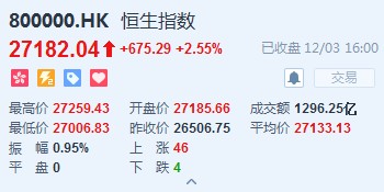 智通財經(jīng)APP獲悉,中美貿(mào)易摩擦憂慮減退,市場情緒得到提振,恒指早盤高開2.56%,報27185.66點。全日維持高位震蕩,截至收盤,恒生指數(shù)漲675.29點或2.55%,報27182.04點,全日成交額達1296.25億。國企指數(shù)漲2.45%,報10882.16點,紅籌指數(shù)漲1.21%,報4391.2點。