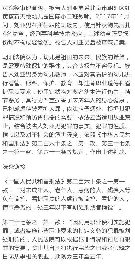智通財經APP獲悉,12月26日上午,北京市朝陽區(qū)人民法院依法對被告人劉亞男(紅黃藍幼兒園教師)虐待被看護人案公開宣判,以虐待被看護人罪一審判處劉亞男有期徒刑一年六個月,同時禁止其自刑罰執(zhí)行完畢之日或者假釋之日起五年內從事未成年人看護教育工作。(肖順蘭)