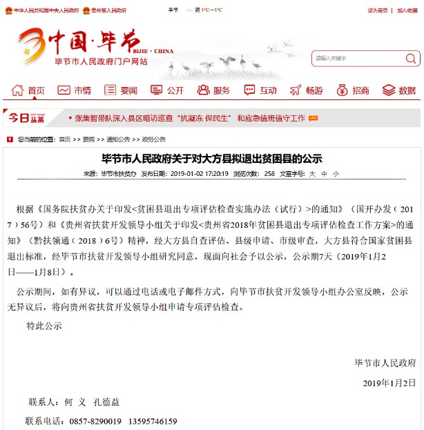 畢節(jié)市人民政府關(guān)于對大方縣擬退出貧困縣的公示