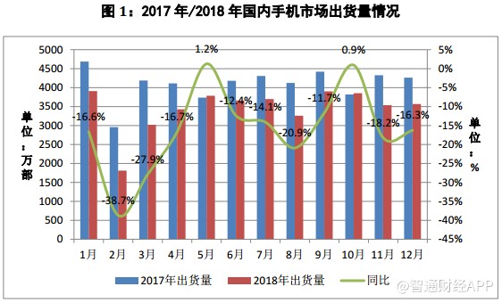 智通財經(jīng)APP獲悉,中國信通院發(fā)布12月份國內(nèi)手機(jī)出貨量報告,2018年12月,國內(nèi)手機(jī)市場總體出貨量3567.4萬部,同比下降16.3%,環(huán)比增長0.9%;2018年全年,國內(nèi)手機(jī)市場總體出貨量4.14億部,同比下降15.6%。
