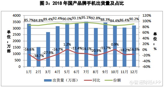 2018年全年,國產(chǎn)品牌手機(jī)出貨量3.71億部,同比下降14.9%,占同期手機(jī)出貨量的89.5%;上市新機(jī)型695款,同比下降29.4%,占同期手機(jī)上市新機(jī)型數(shù)量的91.0%。