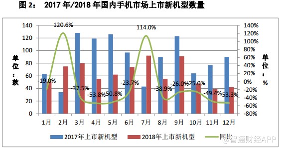 2018年全年,智能手機(jī)上市新機(jī)型587款,同比下降26.5%,占同期上市新機(jī)型數(shù)量的76.8%,其中支持Android操作系統(tǒng)的手機(jī)569款。(劉瑞)