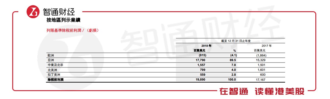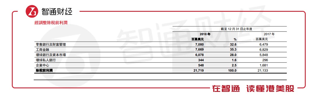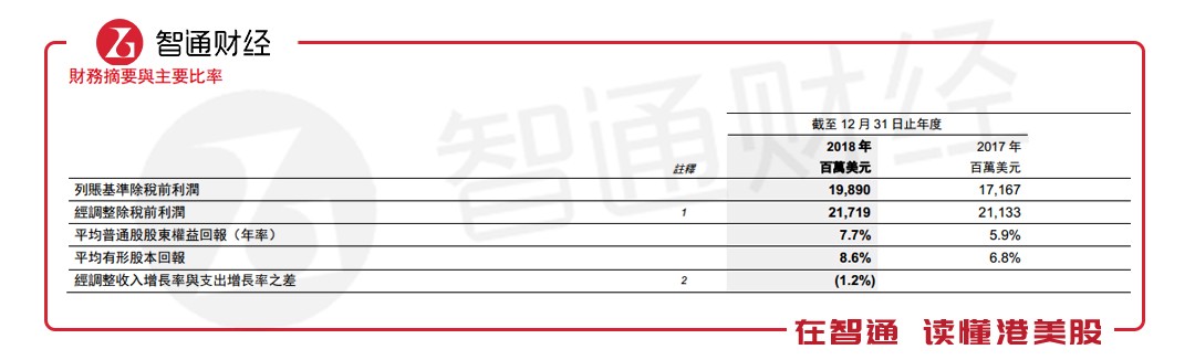 列賬基準除稅前利潤為199億美元,較2017年增加16%。經(jīng)調(diào)整除稅前利潤為217億美元,同比增長3%。