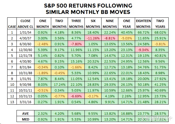 追溯到1950年,標(biāo)普500指數(shù)的月線圖出現(xiàn)過(guò)13次相似的走勢(shì)。如下表所示,在這一形態(tài)出現(xiàn)后的兩年里,股市基本上一直走牛: