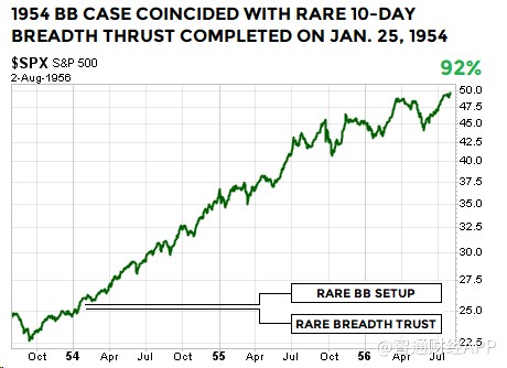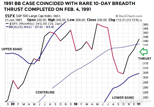 上述布林通道技術(shù)形態(tài)屬較為罕見(jiàn)的類型。值得注意的是,1954年和1991年時(shí)的另一技術(shù)指標(biāo),廣量沖力指標(biāo),基本上與2019年1月21日出現(xiàn)的廣量沖力指標(biāo)形態(tài)類似。因此,在1954年、1991年和2019年,標(biāo)普500指數(shù)走出了布林通道及廣量沖力指標(biāo)都相似的技術(shù)形態(tài)。