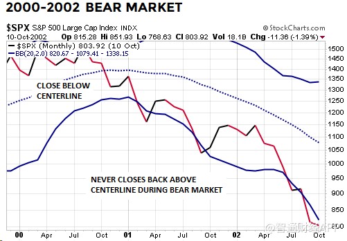 2000-02年熊市也是如此,標(biāo)普500指數(shù)在2000年第四季度跌破中軌以后,就無(wú)法重新回到布林通道中軌之上。如下圖所示,第四季度之后情況進(jìn)一步惡化。2001年2月標(biāo)普500指數(shù)收于下軌以下: