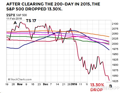 收高于200日均線并非安全信號(hào)。2015年,標(biāo)普500指數(shù)連續(xù)8個(gè)交易日收于200日上方,但隨后下跌了13.30%: