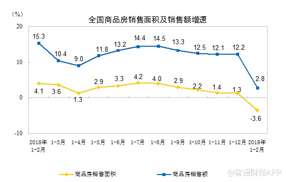 1-2月份,商品房銷售面積14102萬平方米,同比下降3.6%,2018年全年為增長1.3%。其中,住宅銷售面積下降3.2%,辦公樓銷售面積下降15.7%,商業(yè)營業(yè)用房銷售面積下降13.6%。商品房銷售額12803億元,增長2.8%,增速回落9.4個百分點(diǎn)。其中,住宅銷售額增長4.5%,辦公樓銷售額下降6.2%,商業(yè)營業(yè)用房銷售額下降9.4%。