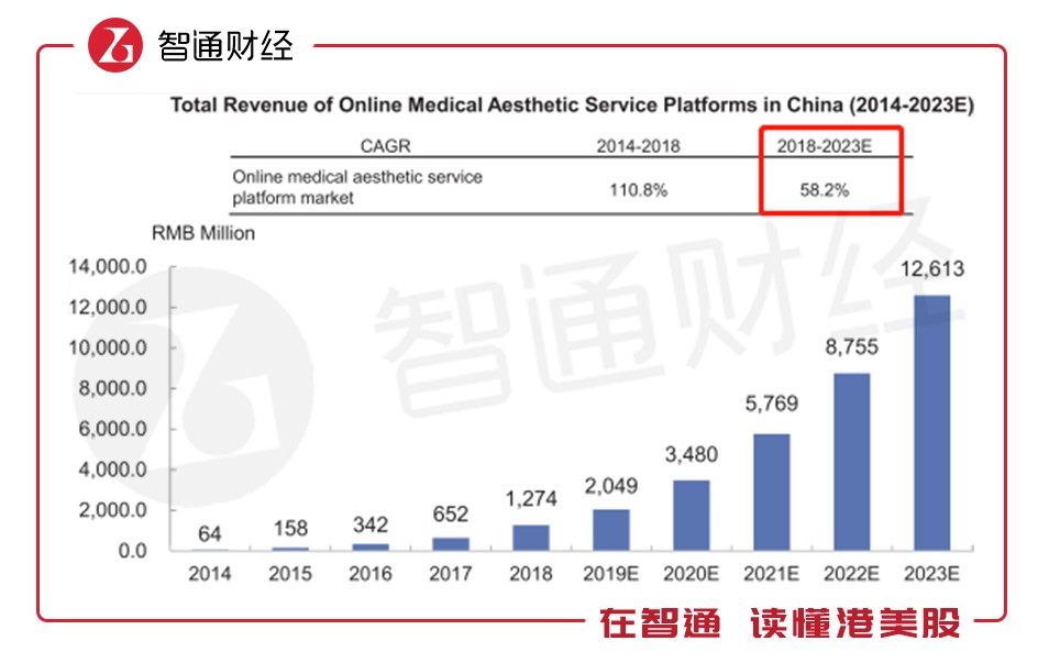 因此,近年來的線上醫(yī)美平臺(tái)憑借自身的優(yōu)勢快速崛起。從2018-2023年,線上醫(yī)美市場預(yù)計(jì)的年復(fù)合增長率為58.2%,遠(yuǎn)快于整體醫(yī)美市場的增長速度。