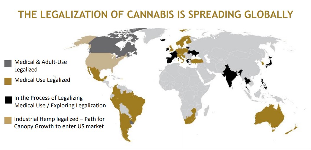 下圖是全球最大的工業(yè)大麻生產(chǎn)商CANOPY GROWTH披露的全球大麻推廣情況圖,從中可以很清晰的看到這一新興行業(yè)政策解禁的進程,而且基本可以確定的是,未來灰色的區(qū)域會越來越少。
