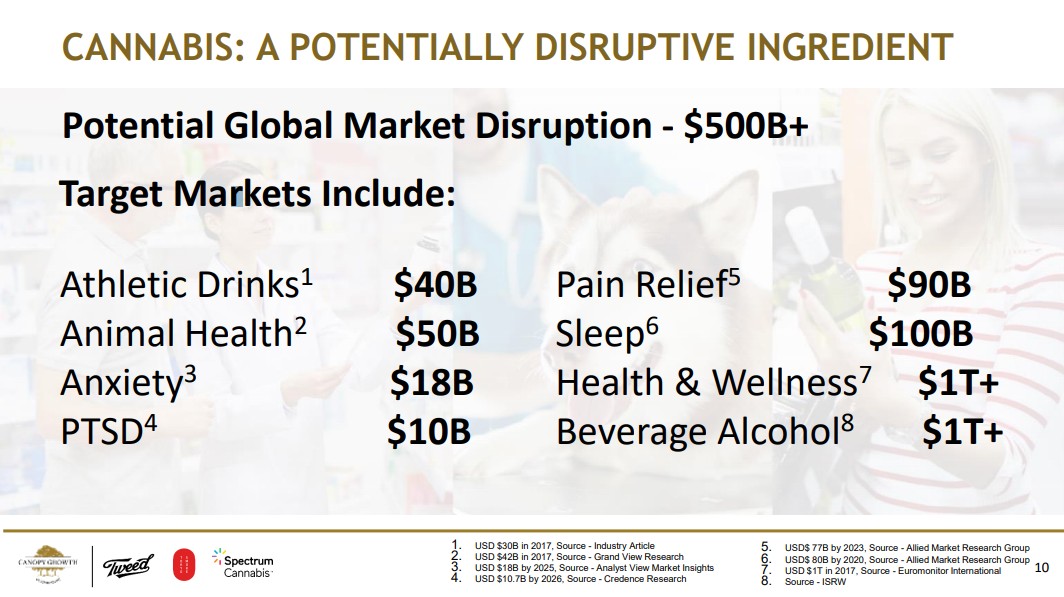 CANOPY GROWTH根據(jù)Allied Market Research Group等調(diào)研機構(gòu)按照不同用途做了一組測算,未來該行業(yè)的將會滲透全球至少5000億美元的市場: