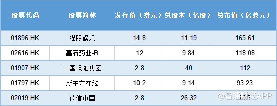據(jù)智通財(cái)經(jīng)APP統(tǒng)計(jì),按上市時(shí)的總股本計(jì)算,一季度的新股整體體量較小,普遍總市值在50億港元以下,僅三只新股總市值超過百億,分別為貓眼娛樂、基石藥業(yè)-B、中國(guó)旭陽(yáng)集團(tuán)。其中,貓眼娛樂以165.61億港元的總市值,成為一季度的最重磅股。
