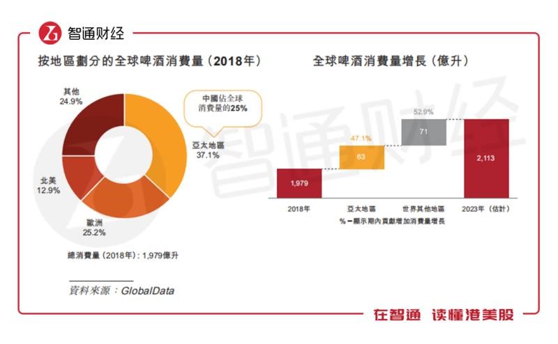 從行業(yè)角度來(lái)看,根據(jù)GlobalData的數(shù)據(jù),截至2018年,按消費(fèi)量及價(jià)值計(jì)算,亞太地區(qū)是全球最大啤酒消費(fèi)市場(chǎng),也是全球啤酒銷量增速最快的地區(qū)之一。2018年亞太占全球啤酒銷量的37%,且預(yù)計(jì)2018年至2023年將貢獻(xiàn)全球啤酒銷量增幅的47%。