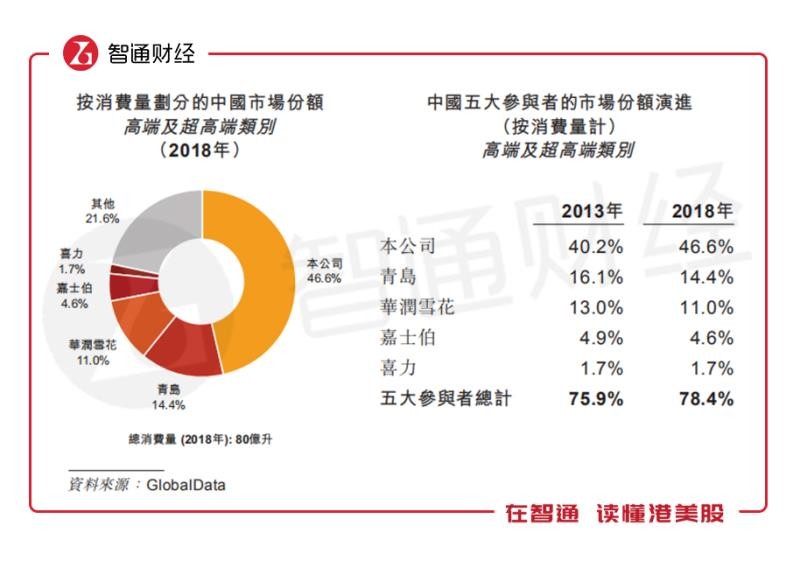 以中國(guó)市場(chǎng)為例,按銷量計(jì),2018年百威在中國(guó)啤酒市場(chǎng)的市占率為16.4%排名次于華潤(rùn)雪花和青島啤酒(00168)位居第三位。但在高端及超高端啤酒領(lǐng)域,百威的份額達(dá)到46.6%,遙遙領(lǐng)先。