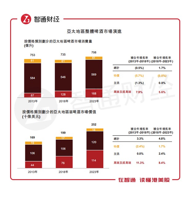 同時(shí),亞太啤酒市場(chǎng)還表現(xiàn)出明顯的高端化趨勢(shì)。根據(jù)GlobalData的數(shù)據(jù),2018年至2023年,亞太地區(qū)高端及超高端啤酒的銷量會(huì)以5.6%的年均復(fù)合增長(zhǎng)率增長(zhǎng)至168億升,市場(chǎng)價(jià)值則以8.4%的年均復(fù)合增長(zhǎng)率增長(zhǎng)至1140億元。