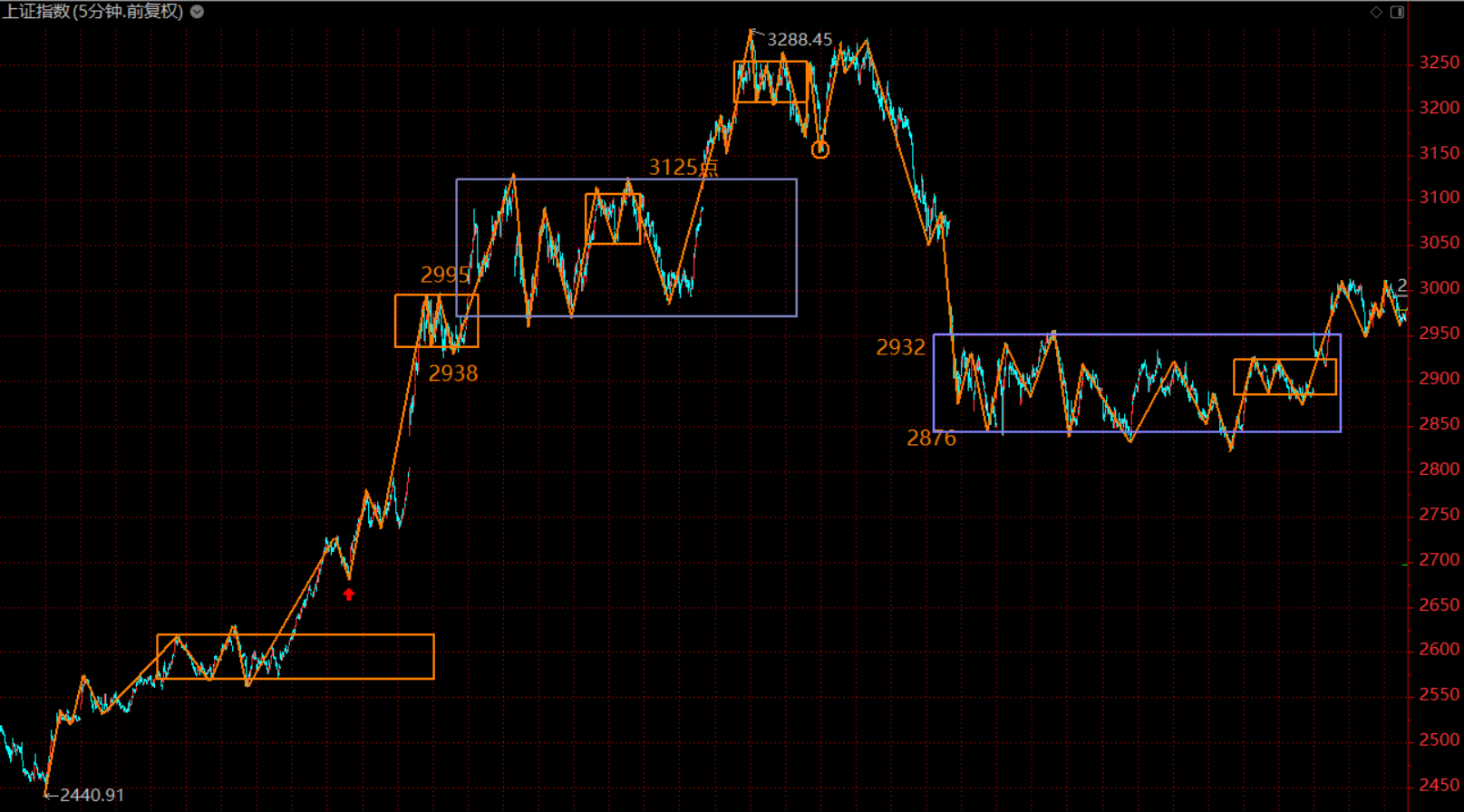 下圖為上證指數(shù)五分鐘級別走勢結(jié)構(gòu)。從走勢結(jié)構(gòu)上看,這里走出標準30分鐘級別第三類買點,本周有望往上繼續(xù)拓展,甚至回補3050點缺口。同時,我們也關(guān)注到,這個位置形成了5分鐘上漲段的第二個中樞,本周的上漲很有可能會形成趨勢背馳。因此,本周的大方向應(yīng)該為持股待漲,越長越賣。在滬指回補缺口過程中,完成降倉。