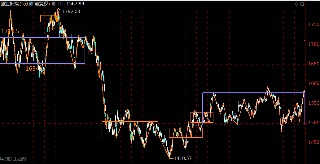 創(chuàng)業(yè)板這里走的比主板強(qiáng)勢(shì)很多,周四的陽線直接修復(fù)了形態(tài),目前在三十分鐘中樞內(nèi)部運(yùn)行,中樞上軌1577點(diǎn),周五已經(jīng)頂?shù)搅酥袠猩宪?,如果下周能突破此中樞,等五分鐘回落線段后構(gòu)建三買,可大膽介入做多。