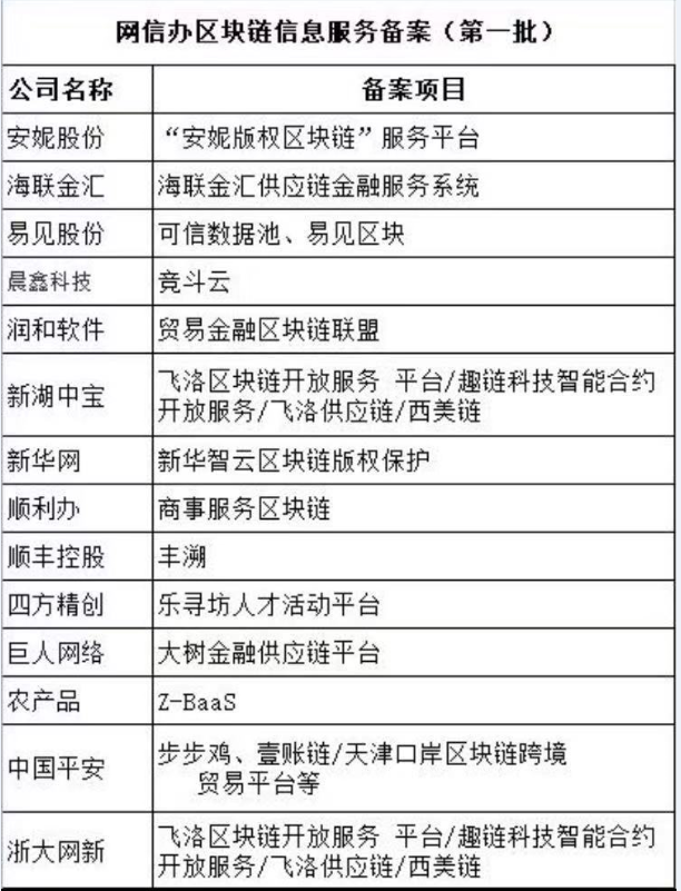第一批區(qū)塊鏈信息服務(wù)備案于3月30日發(fā)布:A股公司涉及安妮股份、海聯(lián)金匯、易見(jiàn)股份、晨鑫科技、潤(rùn)和軟件、新湖中寶、新華網(wǎng)、順利辦、順豐控股、四方精創(chuàng)、巨人網(wǎng)絡(luò)、農(nóng)產(chǎn)品、中國(guó)平安、浙大網(wǎng)新。