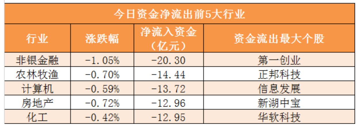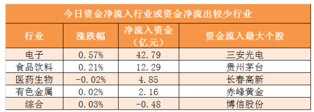 資金流向:28個(gè)申萬一級(jí)行業(yè)中,4個(gè)行業(yè)實(shí)現(xiàn)資金凈流入,其中電子行業(yè)凈流入42.79億元居首。