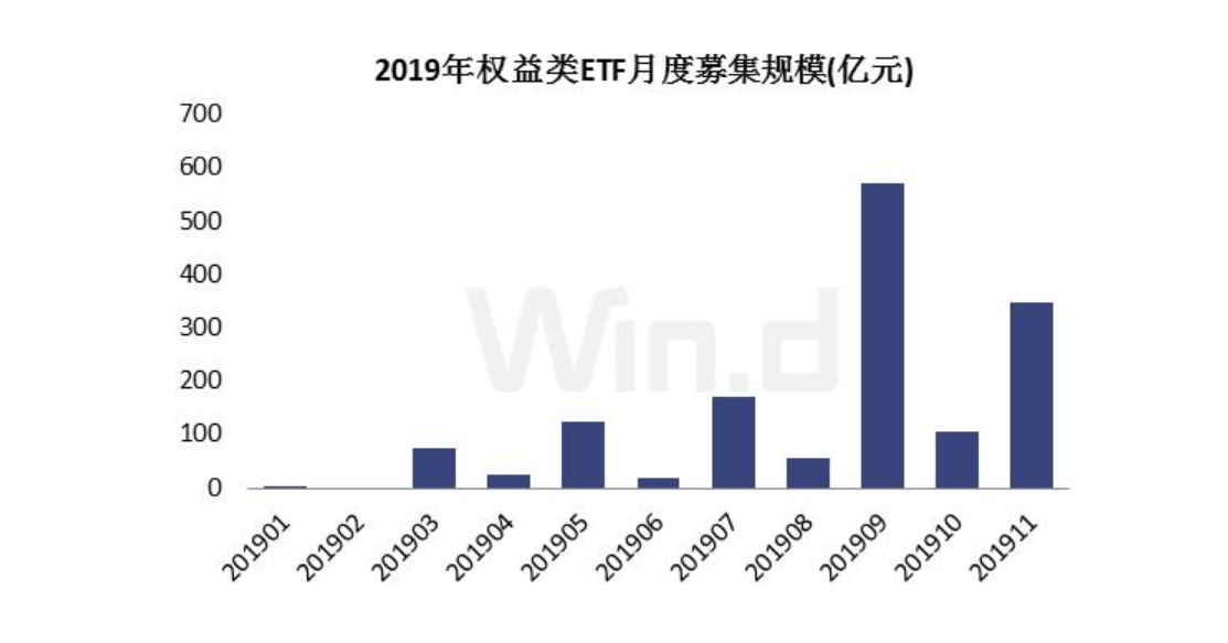 月度數(shù)據(jù)來看,今年9月權(quán)益類ETF募集規(guī)模最大,達(dá)571.98億元;其次就是11月,目前11月尚未過半,權(quán)益類ETF募集規(guī)模已達(dá)348.84億元。