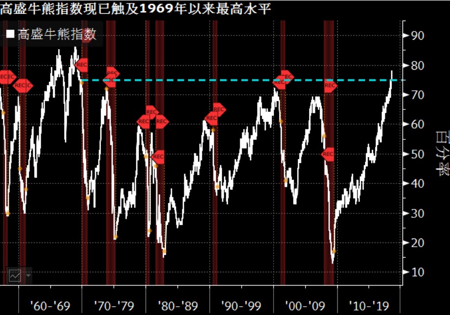 高盛一個(gè)旨在“合理預(yù)警未來熊市風(fēng)險(xiǎn)”的指標(biāo)現(xiàn)已升至將近50年來的最高水平?;诠墒泄乐怠⒔?jīng)濟(jì)增長動(dòng)能、失業(yè)率、通貨膨脹、收益率曲線等數(shù)據(jù)指標(biāo)的高盛牛熊指數(shù)目前觸及的水平為1969年來所不曾見。