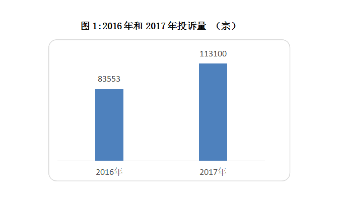 2017年,深圳市、區(qū)消委會共接受消費者投訴113100宗,比2016年的83553宗增長了35.36%?!?15消費通”系統(tǒng)來源投訴65065宗占比58%,12315電話來源投訴45888宗占比41%,可見“315消費通”系統(tǒng)已經(jīng)成為消費者投訴主要方式。