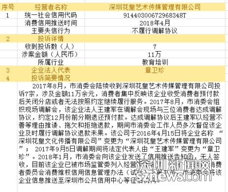 2017年8月,市消委會陸續(xù)收到深圳花皇藝術(shù)傳媒管理有限公司投訴7宗,涉及金額11萬余元,消費(fèi)者集中反映該企業(yè)收受消費(fèi)者預(yù)付款后關(guān)閉分店或者無法按照約定繼續(xù)履行服務(wù)。2017年8月,市消委會組織現(xiàn)場調(diào)解會,該企業(yè)法人王建軍在調(diào)解會現(xiàn)場與三位消費(fèi)者達(dá)成調(diào)解協(xié)議,約定12月份前分期退還預(yù)付款。達(dá)成調(diào)解協(xié)議后王建軍以經(jīng)營不善等理由推諉、拖欠和拒絕退款,期間市消委會工作人員多次督促該企業(yè)及時(shí)履行調(diào)解協(xié)議退款未果。該公司于2016年4月15日將企業(yè)名稱 “深圳花皇文化傳播有限公司”變更為“深圳花皇藝術(shù)傳媒管理有限公司”; 2017年9月5日調(diào)解期間將法定代表人由“王建軍”變更為“章衛(wèi)珍”。2018年1月,市消委會向該企業(yè)發(fā)送了信用推送告知函,無人簽收,目前該企業(yè)已被市場監(jiān)管委列入經(jīng)營異常名錄。依據(jù)《深圳市消費(fèi)者委員會消費(fèi)維權(quán)信用信息管理辦法(試行)》第九條,市消委會將該企業(yè)信息推送至深圳市公共信用中心等征信機(jī)構(gòu)。該企業(yè)雖然變更了公司名稱和法定代表人等公司信息,但仍需承擔(dān)原企業(yè)未履行的法定或約定義務(wù)。
