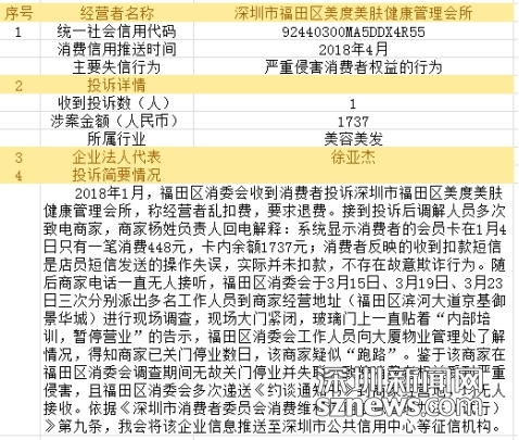 2018年1月,福田區(qū)消委會收到消費(fèi)者投訴深圳市福田區(qū)美度美膚健康管理會所,稱經(jīng)營者亂扣費(fèi),要求退回余額(會員卡余額1737元)。接到投訴后調(diào)解人員多次致電商家,商家楊姓負(fù)責(zé)人回電解釋:系統(tǒng)顯示消費(fèi)者的會員卡在1月4日只有一筆消費(fèi)448元,卡內(nèi)余額1737元;消費(fèi)者反映的收到扣款短信是店員短信發(fā)送的操作失誤,實(shí)際并未扣款,不存在故意欺詐行為。隨后商家電話一直無人接聽,福田區(qū)消委會于3月15日、3月19日、3月23日三次分別派出多名工作人員到商家經(jīng)營地址(福田區(qū)濱河大道京基御景華城)進(jìn)行現(xiàn)場調(diào)查,現(xiàn)場大門緊閉,玻璃門上一直貼著“內(nèi)部培訓(xùn),暫停營業(yè)”的告示,福田區(qū)消委會工作人員向大廈物業(yè)管理處了解情況,得知商家已關(guān)門停業(yè)數(shù)日,該商家疑似“跑路”。鑒于該商家在福田區(qū)消委會調(diào)查期間無故關(guān)門停業(yè)并失聯(lián),致使消費(fèi)者權(quán)益受到嚴(yán)重侵害,且福田區(qū)消委會多次遞送《約談通知書》到商家經(jīng)營地,均無人接收。依據(jù)《深圳市消費(fèi)者委員會消費(fèi)維權(quán)信用信息管理辦法(試行)》第九條,我會將該企業(yè)信息推送至深圳市公共信用中心等征信機(jī)構(gòu)。