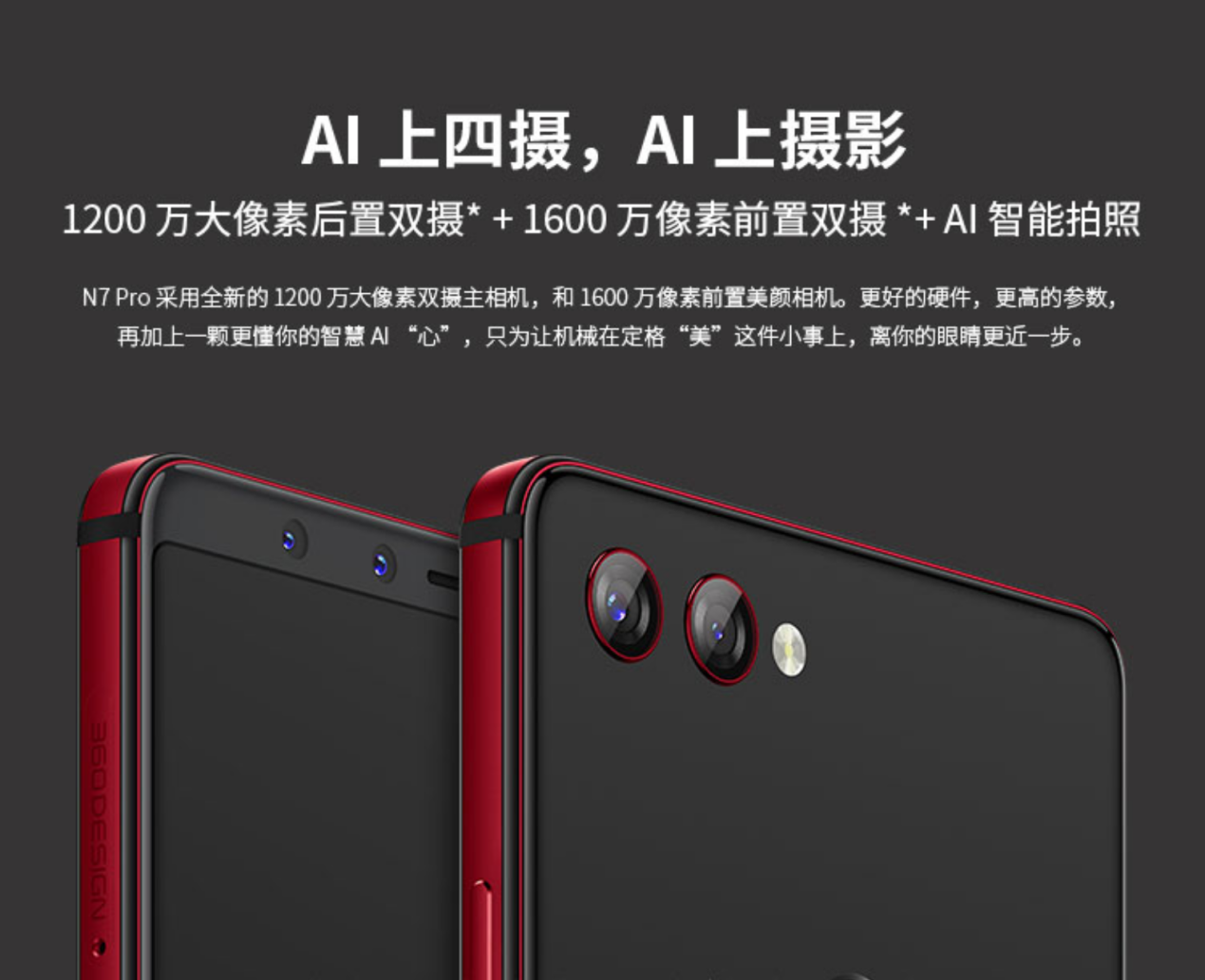 360手機N7 Pro采用了雙面玻璃機身設(shè)計,無劉海5.99英寸全面屏,分辨率2160×1080像素,有珊瑚紅和瑪瑙黑兩色可選。作為2018年度的旗艦機型,配置上,N7 Pro搭載當前高通家族中最受關(guān)注的驍龍710處理器,4000mAh大容量電池,支持18W快充,官方宣稱20分鐘可充電30%,100分鐘可充滿。此外在拍照方面,360手機N7 Pro采用了堪稱耀眼的四攝設(shè)計。