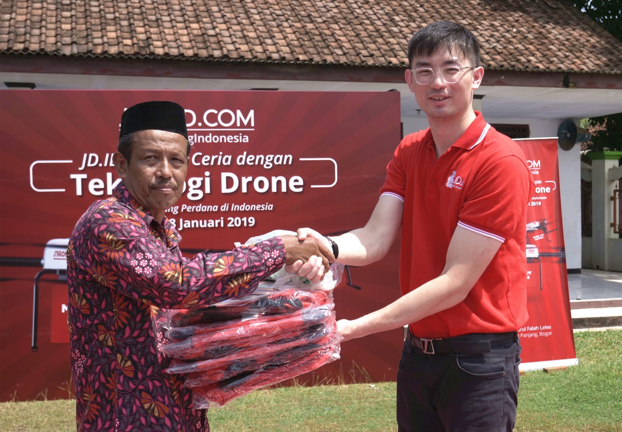 京東印尼 CEO章力(右)將捐贈(zèng)物資交給當(dāng)?shù)匦W(xué)校長(zhǎng)