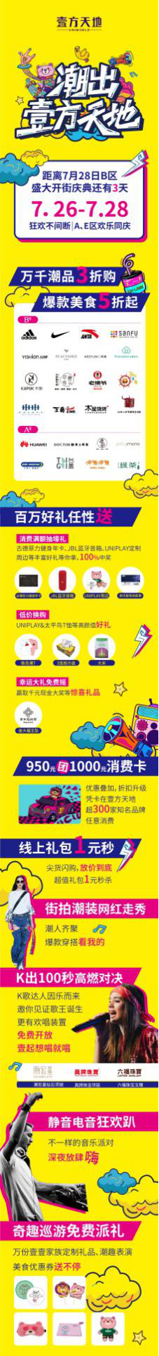開業(yè)期間,精彩紛呈的活動當(dāng)然是必不可少的。7.26-7.28開業(yè)期間,B區(qū)將聯(lián)動A區(qū)、E區(qū)開展一系列活動。開業(yè)活動緊扣B區(qū)定位“潮流品味先鋒主場”,充分抓住當(dāng)下年輕人愛玩、敢玩的特色,將整個壹方天地變?yōu)槌比?、炫酷的歡樂海洋。