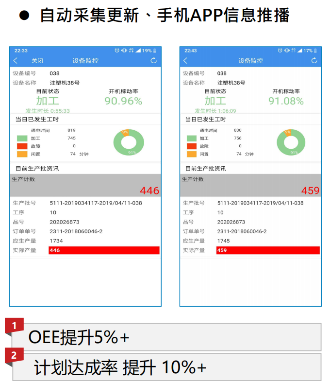 智能換模工業(yè)APP,偵測換模時機(jī),縮減時效與提升質(zhì)量。尋模備模調(diào)機(jī)時間縮減約80%(原30分鐘,現(xiàn)約5分鐘);裁線工站設(shè)備稼動率提升20%(單臺每日產(chǎn)能提升40分鐘,每日毛利約增加1.6萬)。