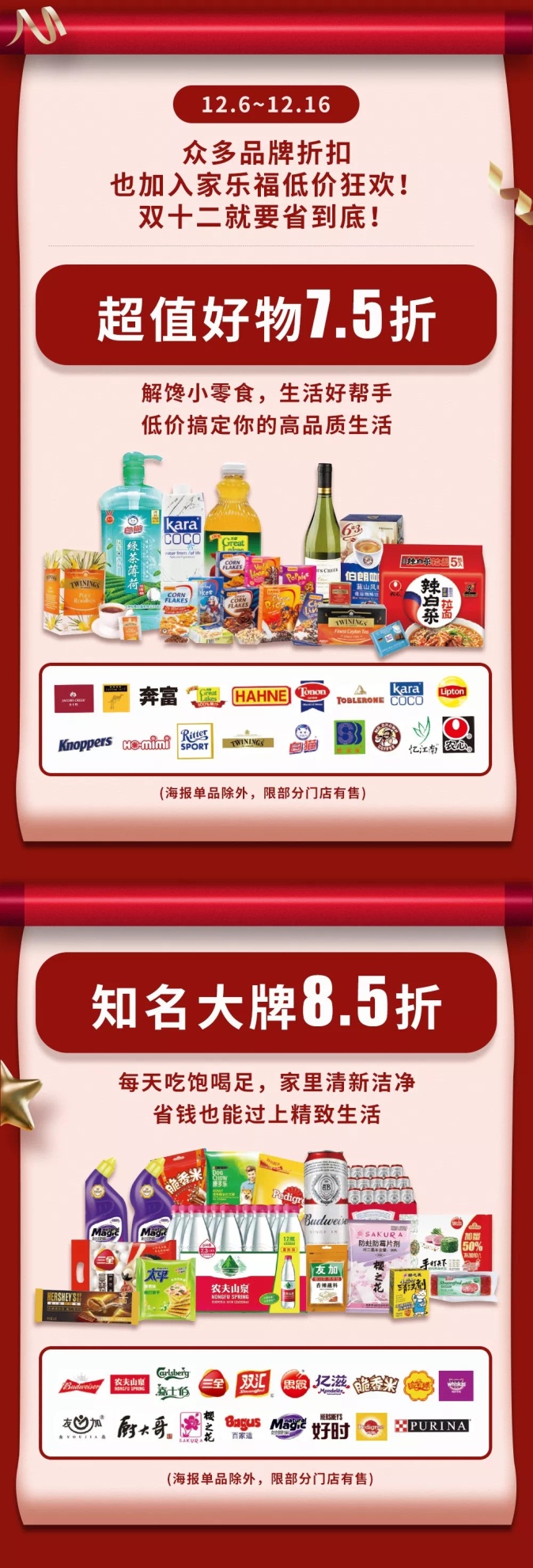 12月6日至16日,奔富、袋鼠、大湖、白貓、立頓、農(nóng)心、伯朗咖啡、憶江南等知名品牌商品,推出限時(shí)7.5折。百威、農(nóng)夫山泉、三全、雙匯、億滋、好時(shí)、偉嘉等大牌商品,奉上限時(shí)8.5折。寶潔系列產(chǎn)品,組合購買,滿減更加優(yōu)惠;聯(lián)合利華系列產(chǎn)品,兩件折扣、勁爆組合價(jià)、買一送一歡樂購。