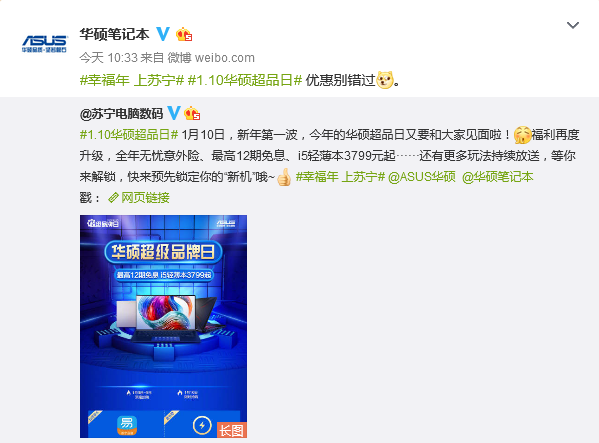1月10日,今年的蘇寧易購華碩超品日將再次啟動,1月3日正式進入預熱階段,今天早上蘇寧電腦數(shù)碼官微賬號,發(fā)布了今年華碩超級品牌日活動的正式信息,華碩官方賬號也第一時間與之進行了回應(yīng)互動。