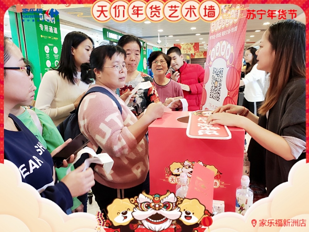 天價(jià)年貨藝術(shù)墻,藝術(shù)年貨送不停 ! 1月17日 至 1月 19 日 , 家樂(lè)福華南區(qū)廣州員村店、珠海吉大店、福州寶龍店 、廈門中華城店及 深圳新洲店 (活動(dòng)時(shí)間為1.16-1.18) 活動(dòng)繼續(xù) 。 禮品數(shù)量有限,每天送完即止 !蘇寧家樂(lè)福 實(shí)力助你過(guò)年味滿滿的春節(jié) ,邀請(qǐng)您 來(lái)把年貨驚喜領(lǐng)回家 !