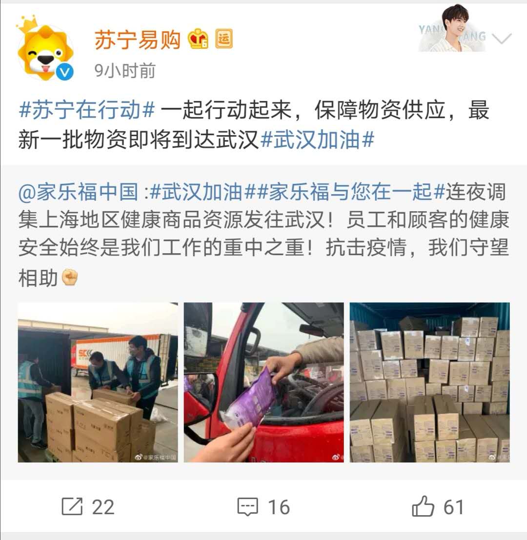在疫情后方,不少后勤保障單位、組織也是做好了充足的準(zhǔn)備。1月23日,蘇寧旗下家樂福中國官方微博發(fā)布了一條關(guān)于 #家樂福堅(jiān)決不漲價(jià),虧錢也不能漲!#的微博表示,家樂福中國管理團(tuán)隊(duì)承諾春節(jié)期間民生用品不漲價(jià),同時(shí)針對(duì)武漢及全國范圍都提前備好充足貨量,誓與全國人民一起共渡難關(guān)。