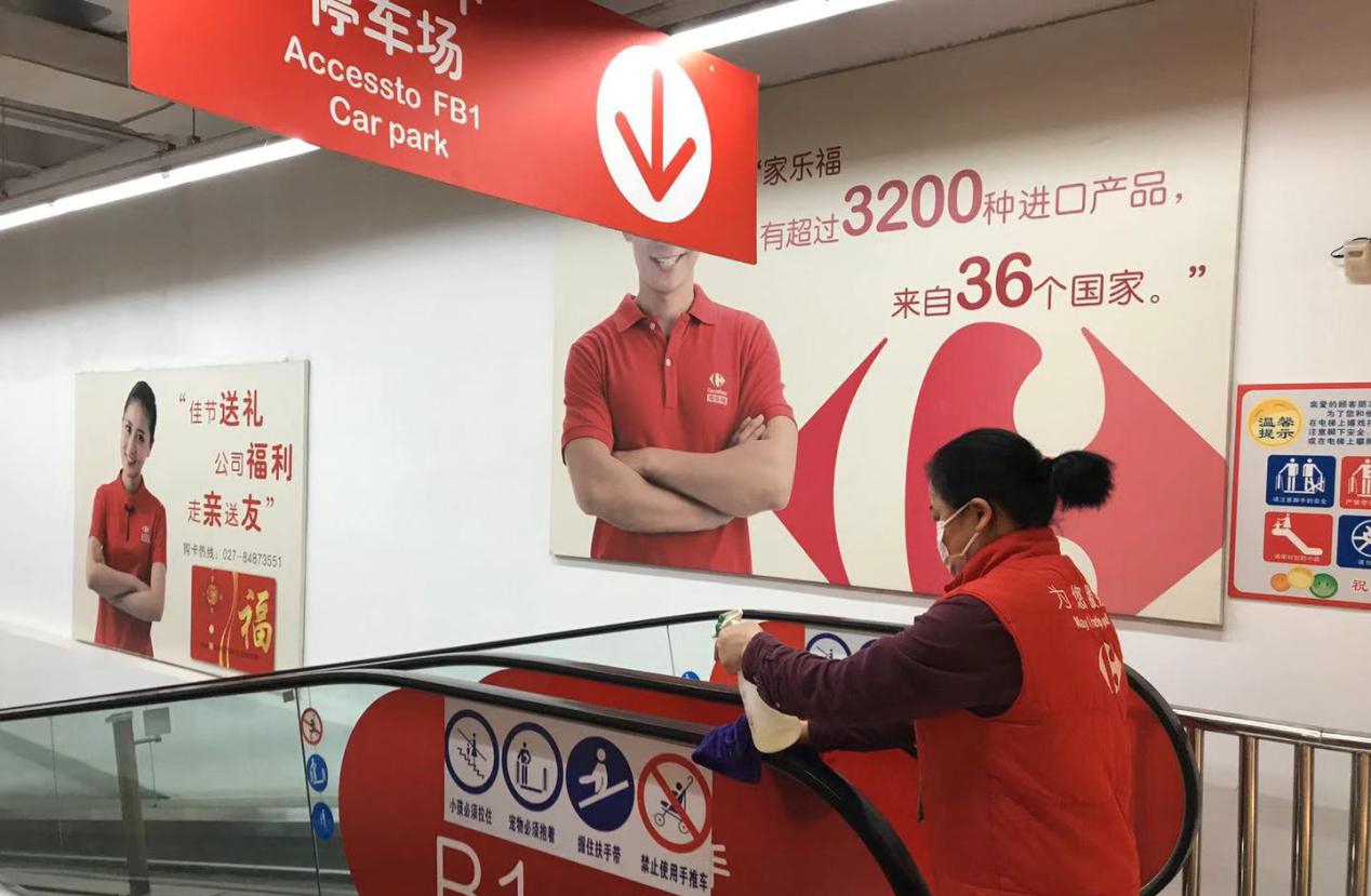 為確保健康、安心的購物環(huán)境,家樂福加強各項安全防范措施,員工每日測體溫戴口罩上崗,地面、自動扶梯把手、購物車、購物籃每2小時消毒一次,廁所每1小時消毒一次。以武漢為例,春節(jié)期間門店清潔消毒已消耗1000瓶消毒液、700瓶洗手液,員工嚴格遵守口罩更換程序,共消耗近20000個口罩。