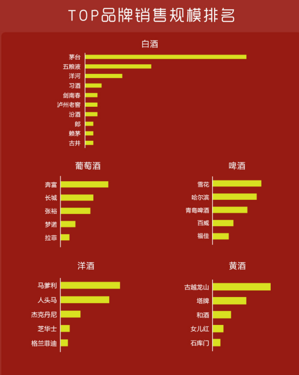 具體來說,從蘇寧超市公布的品牌銷售規(guī)模排行榜來看,茅臺、五糧液、洋河、習(xí)酒、劍南春、瀘州老窖、汾酒、郎酒、賴茅、古井成為當(dāng)之無愧的白酒品類銷售top10品牌。奔富、長城、張裕、夢諾、拉菲則成功問鼎葡萄酒銷售top5,雪花、哈爾濱、青島、百威、福佳在啤酒品類中銷售表現(xiàn)最好。馬爹利、古越龍山則分別成為洋酒、黃酒品類銷售冠軍。