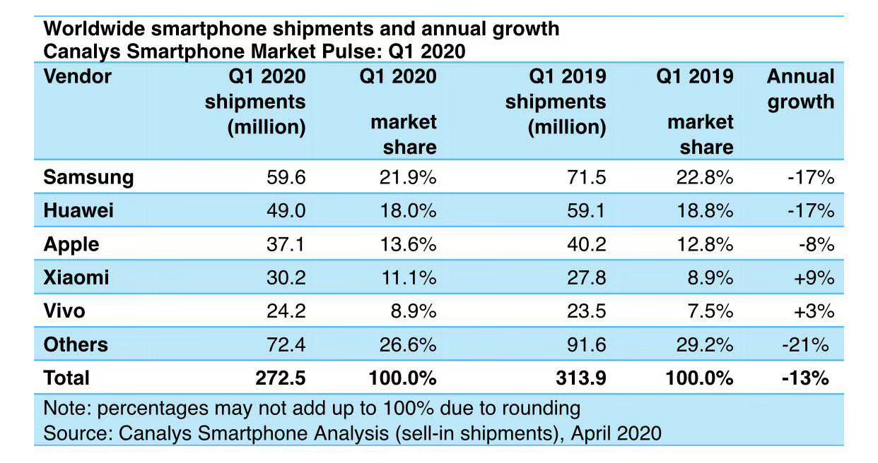 另一家國(guó)際權(quán)威機(jī)構(gòu)Canalys也在今天發(fā)布了今年一季度全球智能手機(jī)的出貨量報(bào)告,前五大手機(jī)廠商的排名和IDC的報(bào)告一樣。該報(bào)告顯示,今年一季度全球智能手機(jī)出貨量受新冠疫情影響下降13%,而vivo在重回前五的同時(shí),全球出貨量逆勢(shì)同比增長(zhǎng)3%。