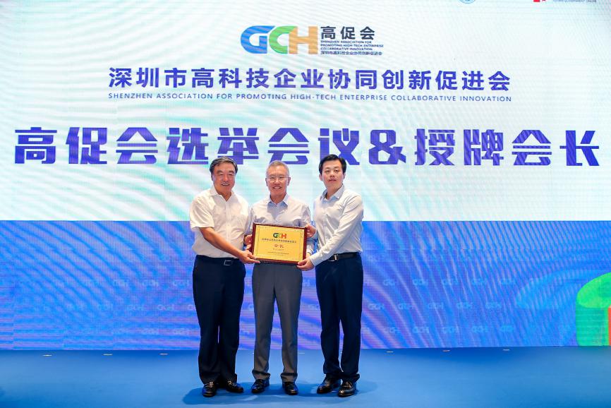 高促會會長靳曉明因北京疫情原因無法來到現(xiàn)場,由高促會高級顧問邢繼俊代表靳會長接受由榮譽會長馬蔚華和福田區(qū)科技創(chuàng)新局局長張忠暉頒發(fā)的高促會會長牌匾。